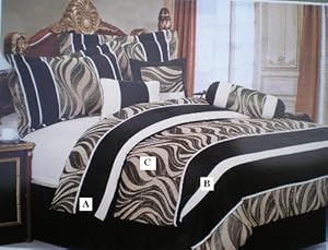 Product Description : The package includes 7 Piece designer Style Comforter Set bedding in a bag. Comforter, Dust Ruffle, Neck Roll, Cushions (2), and Shams (2) Reinvent your bedroom with this refreshingly vivid Black / Brown / Beige. The designer style modern comforter set will infuse fashionable ambiance to your room and its elegant feel would provide blissful comfort and sweet dreams. The material is faux linen feeling polyester. Size Chart: Queen size comforter set1 Queen comforter 86x86" . 1 Bedskirt 60x80"+14" . 2 Queen or standard shams 20x28"+2.5" . 1 Cushion 16x16" . 1 Breakfast pillow 12x16" 1 Neck roll / bolster 6.5x16" . . King size comforter set 1 King comforter 10x92" . 1 Bedskirt 78x80"+14" . 2 Standard shams 20x28"+2.5" . 1 Cushion 16x16" . 1 Breakfast pillow 12x16" 1 Neck roll / bolster 6.5x16" Wash Instruction in side The colors may vary because of computer monitors. This beautiful windows curtain set include two panels, each panel has size of 60"W and 84" L. Total 120" W . Each panel has back linen sewn behind and valance sewn on top. So only one curtain pod needed to setup the curtain. Recommend: One set of curtains will fit a window less than 70" wide or fit two small windows that are less than 40" wide.