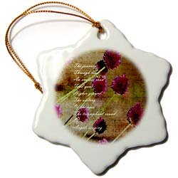 Product Description : Size: 3 inch Snowflake Porcelain OrnamentAngels Singing Inspired Pink Garden Floral - Poetry by Patricia Sanders Ornament is a perfect addition to your tree or as a window decoration. This glossy porcelain ornament is a great gift for family and friends, commemorating each holiday or special occasion. Image printed on both sides; measures 3 inches. A strand of gold thread makes it easy to display this fantastic keepsake.